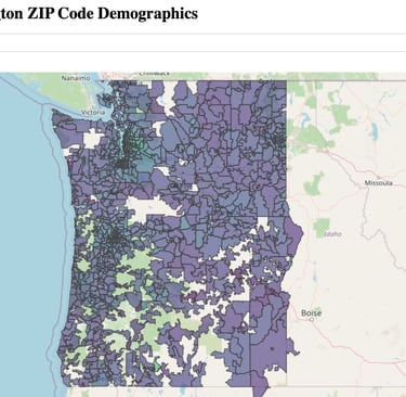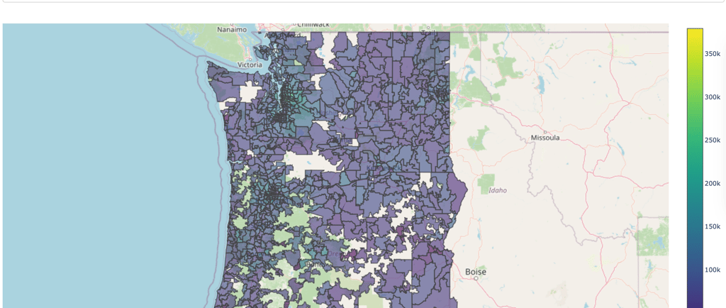 The app leverages Plotly’s Choroplethmapbox feature to plot ZIP codes across Oregon and Washington. By using latitude and longitude from the ZIP code boundaries, each geographic region is filled with colors corresponding to the selected demographic variable.