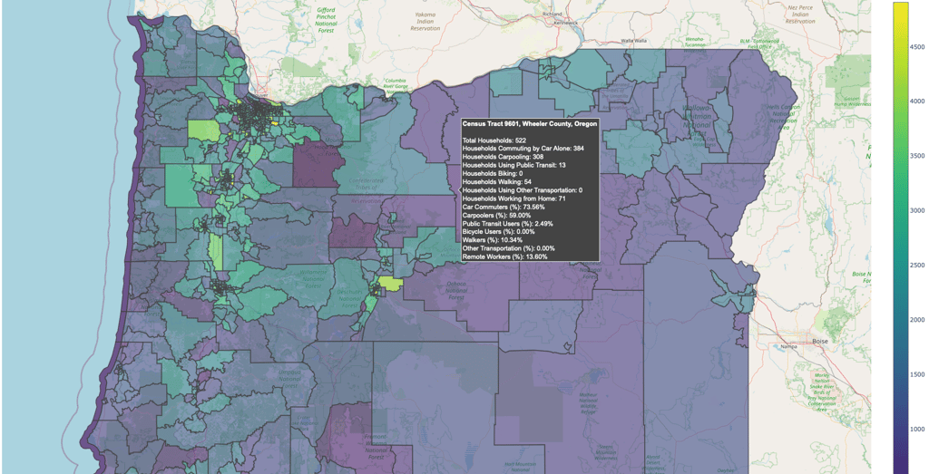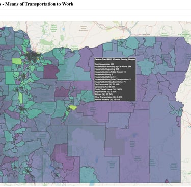 Understanding how people commute to work is critical for shaping public policy, urban planning, and transportation infrastructure. This interactive visualization, hosted as a Dash app, showcases the means of transportation used by Oregon residents to commute to work, based on census tract-level data from the U.S. Census Bureau.